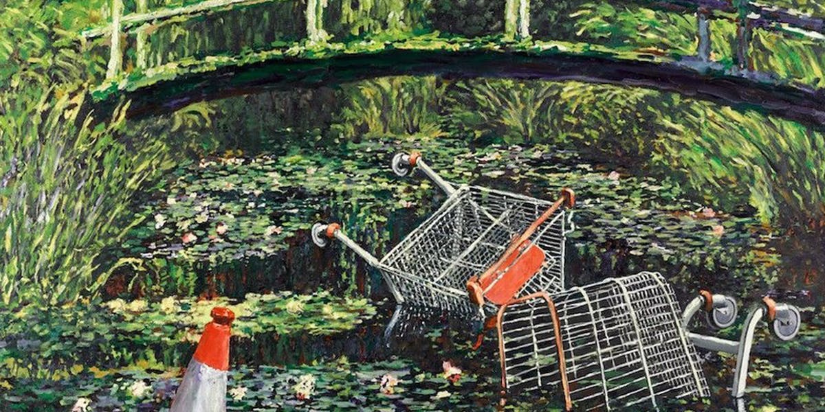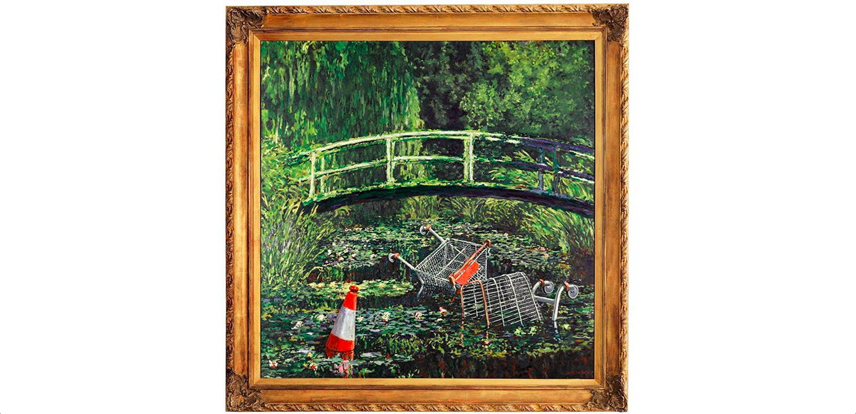 Auktionshaus Sotheby S Banksy Monet Fur 9. Show me the Monet a Banksy re-imagining of Claude Monets Bridge over a Pond of Water Lilies featuring traffic cones and discarded shopping carts has just sold at. Estimated to fetch anywhere from 3 million to 5 million 39 million to 65 million the painting is an homage to Claude Monet.